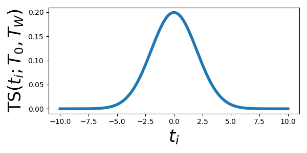 \[ TS(t_i; T_0, T_W) = \frac{1}{\sqrt{2\pi (T_W/2)^2}} e^{-\frac{(t_i - T_0)^2}{2 (T_W/2)^2}} \]